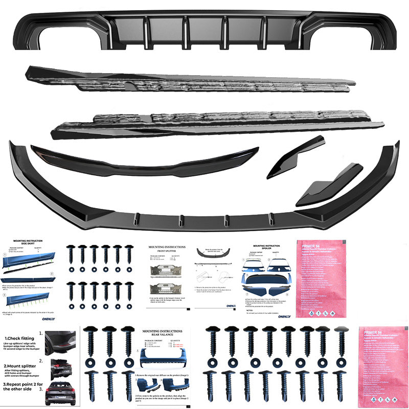 The set includes: front spoiler, rear spoiler, side skirts, diffuser, rear side splitters