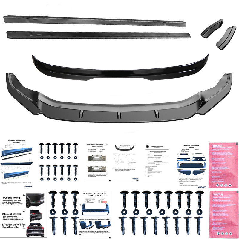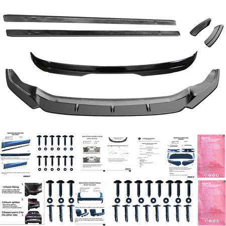 The set includes: front spoiler, rear spoiler, side skirts, rear side splitters