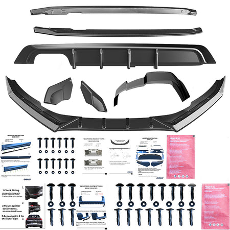 The set includes: front spoiler, roof spoiler, side skirts, diffuser, rear side splitters