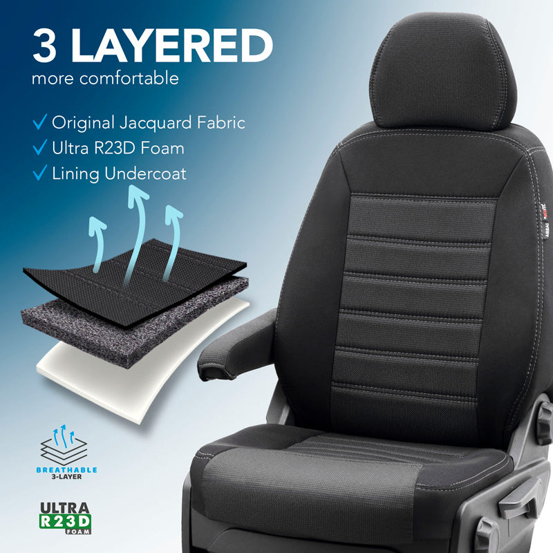 otoM, Originale Tekstil Sædebetræk 2+1 - Sort med Grå Syninger - passer til Mercedes Sprinter 2018-