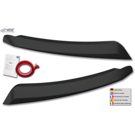 This set of head light spoilers is made of high-quality ABS/PUR plastic in original equipment quality. Supplied in black, they are flexible, break- and splinter-resistant.